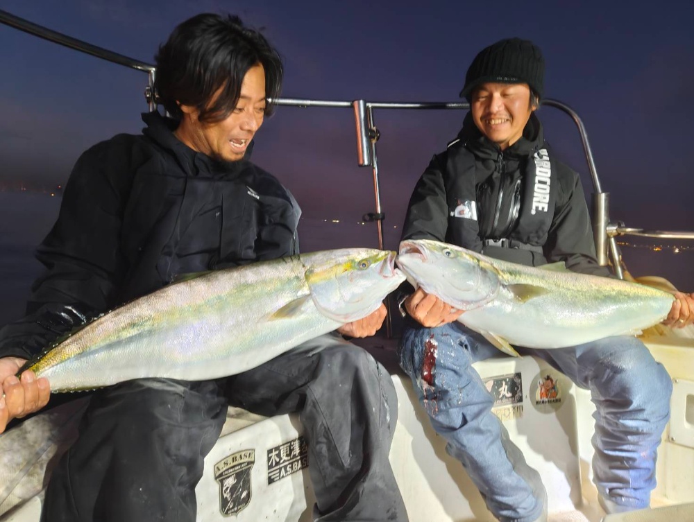 2023年1月2日.明けましておめでとうございます。本年もご贔屓に宜しくお願い致します🎍m(__)m、新年初出船は、青物ジギングでした。渋かったですが、何とか、48㌢のイナダ、45㌢のカンパチ(ショゴ)が釣れました。お二方はジギング初心者で練習でした。また明日リベンジです。